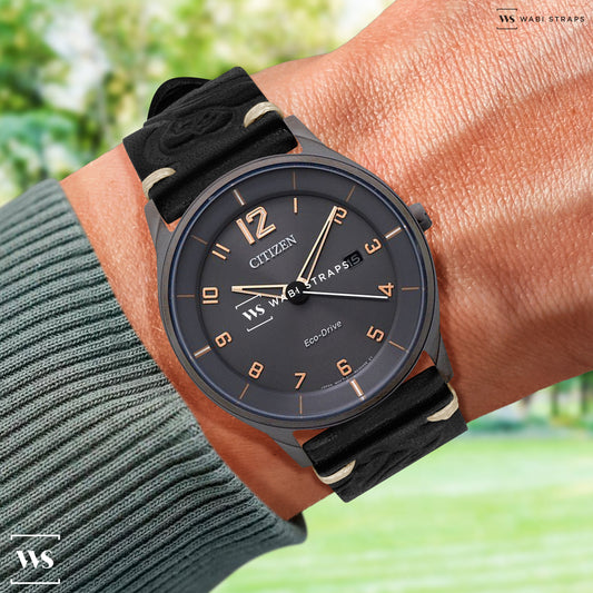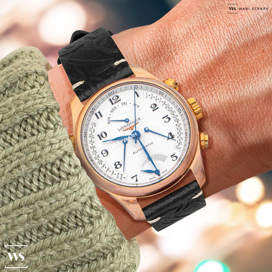 Black Floral Pattern Embossed Leather Strap