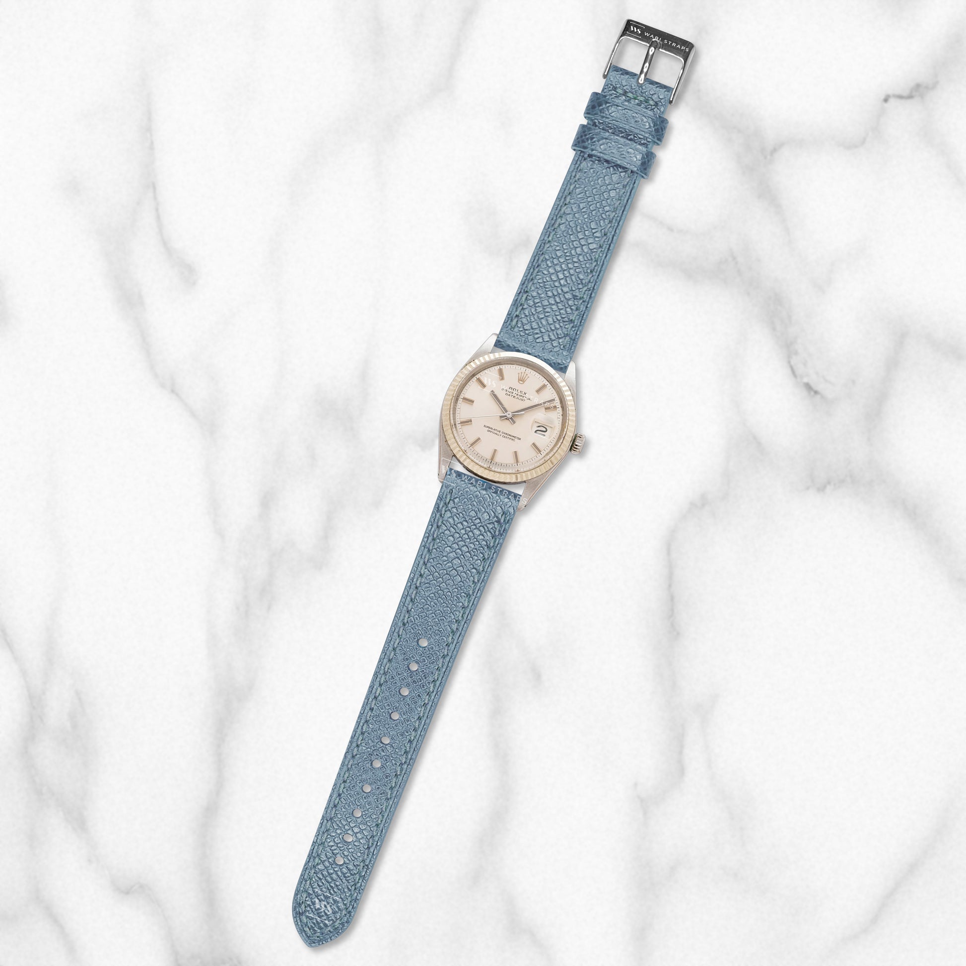 The Baby Blue Epsom Pebbled Texture Leather Strap is a refreshing blend of playful charm and refined elegance. Crafted in a soft baby blue hue, this strap features a distinct pebbled texture that adds depth and character, giving it a bright yet sophisticated appeal. The Epsom leather’s unique grain is not only visually appealing but also enhances durability, making it resistant to scratches and daily wear. This strap is perfect for pairing with minimalist or modern timepieces, adding a light, airy touch to both formal attire and casual outfits. Whether you’re enjoying a sunny day or attending a special occasion, the Baby Blue Epsom Pebbled Texture Leather Strap brings a hint of playful sophistication to your look.